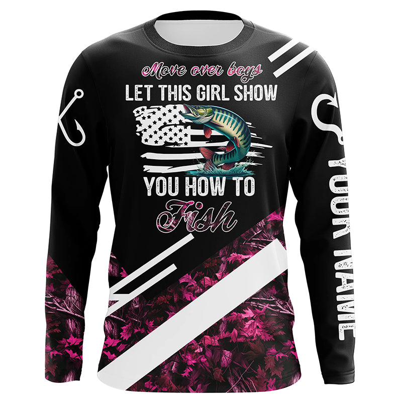 Move over boys let this girl show you how to fish Musky fishing pink camo custom name 3D fishing shirt NQS5162
