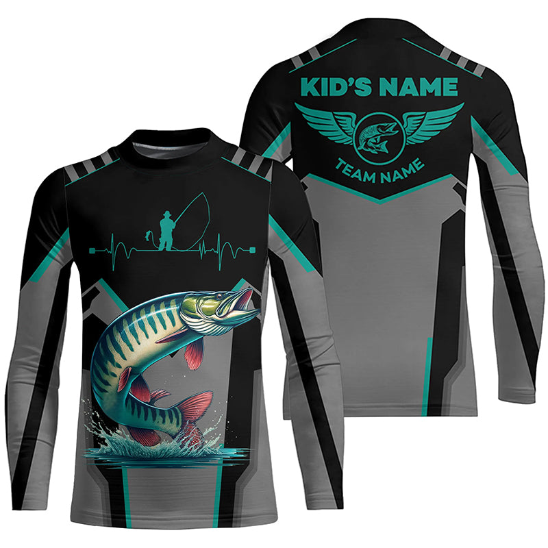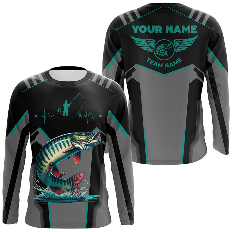 Personalized Black Musky Fishing jerseys, Team Muskie Fishing Long Sleeve tournament shirt| Green NQS6287