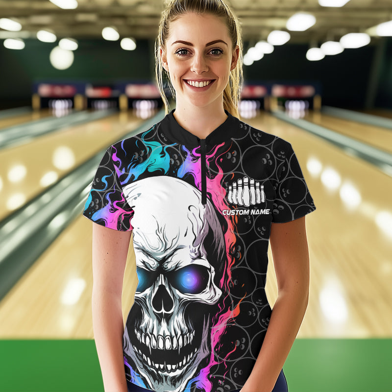 Custom Blue And Pink Flame Skull Bowling Women Quarter-Zip Shirt, Bowling Team League Shirt IPHW8853