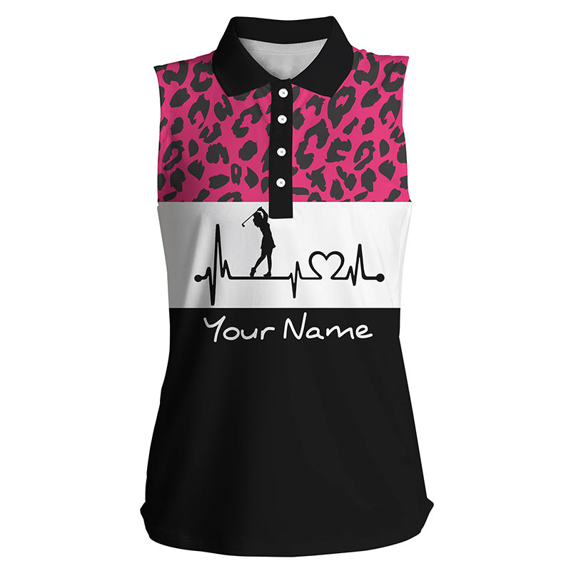 Women's sleeveless golf polo shirt custom pink leopard pattern golf heartbeat, golfing gifts for women NQS4962