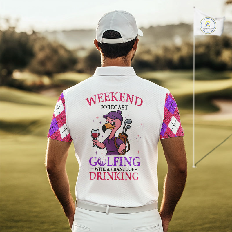 Pink & purple glitter argyle pattern Flamingo Men golf polo shirt Custom weekend forecast golf & wine NQS10325