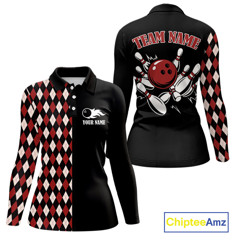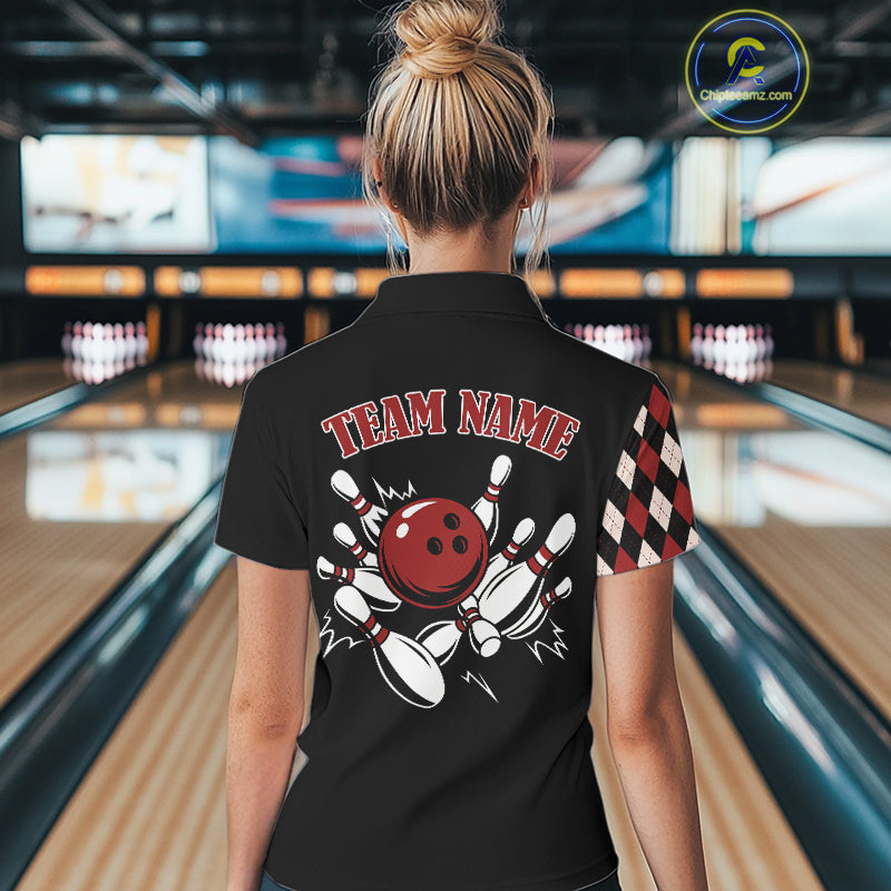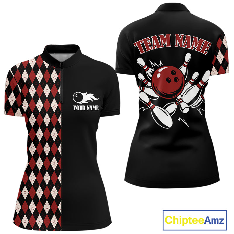 Black and Red Argyle Pattern Retro Women Bowling Polo, Quarter Zip Shirt Custom Team Bowling Outfit NQS10510