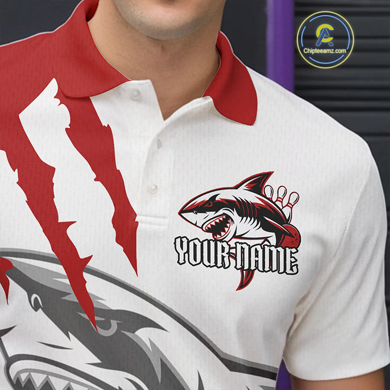 Custom White And Red Shark Jerseys, Shark Bowling Team Men Polo Shirts Bowlers Outfit IPHW8987