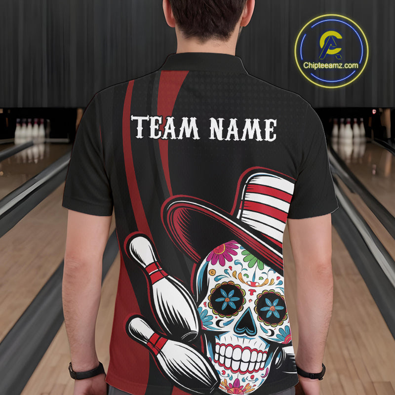 Custom Black And Red Sugar Skull Bowling Team Polo Shirts For Men, Bowling League Shirt IPHW9256