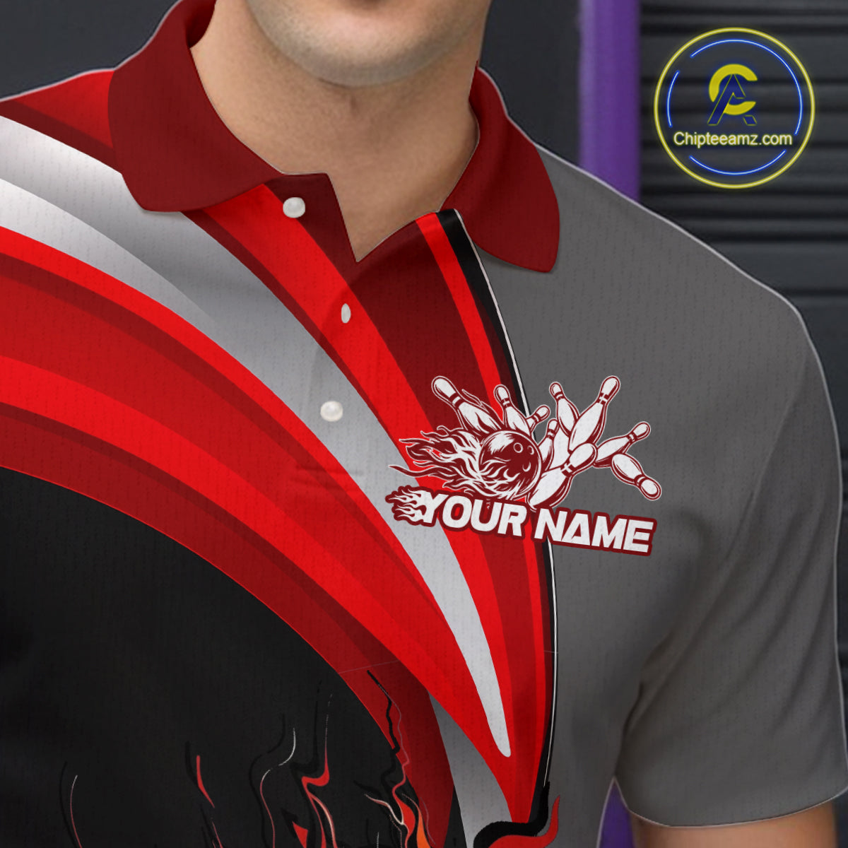 Custom Black, Red And Gray Flame Bowling Polo Shirts For Men, Bowling Team League Shirt IPHW9273
