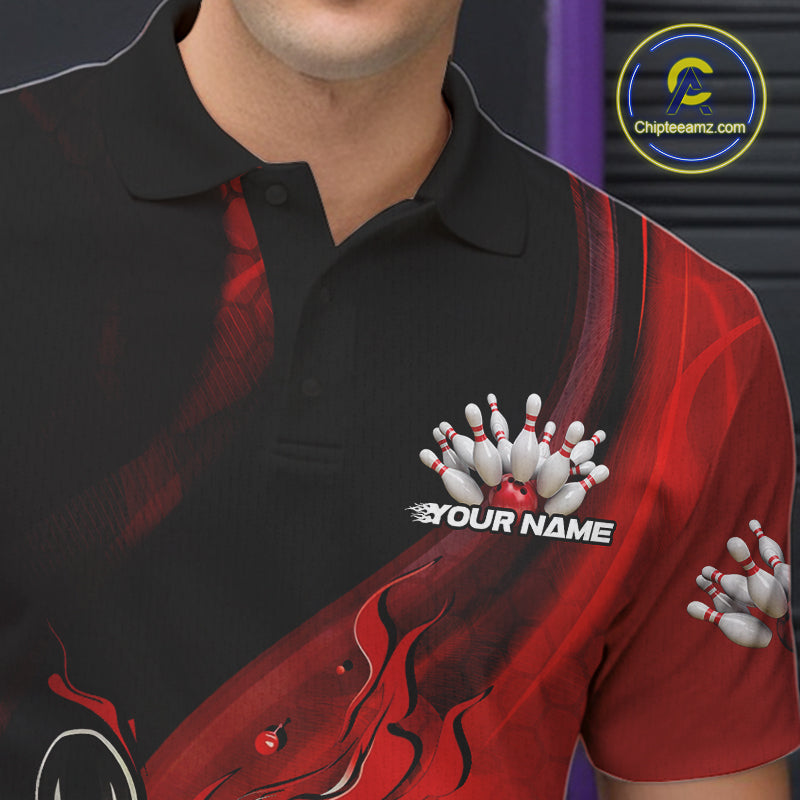 Custom Black And Red Flame Bowling Polo Shirt For Men, Bowling Team League Shirt IPHW9872