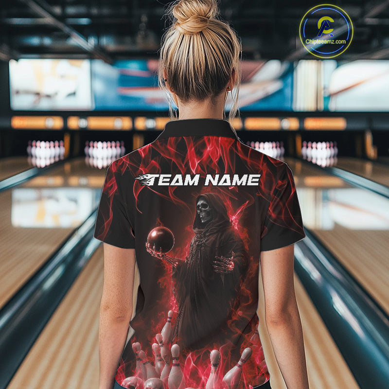 Custom Red Flame Grim Reaper Bowling Polo Shirts For Women, Halloween Bowling Outfit IPHW9730