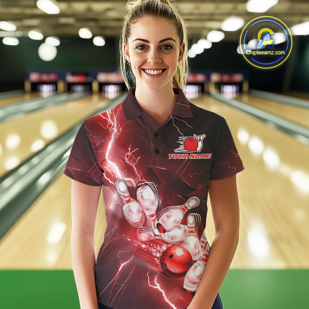 Custom Red Thunder Lightning Bowling Polo Shirts For Women, Bowling League Shirt IPHW9794