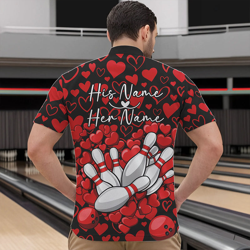 Black And Red Heart Theme Custom Valentines Bowling Quarter-Zip Shirt For Men, Couple Bowling Shirt IPHW8336