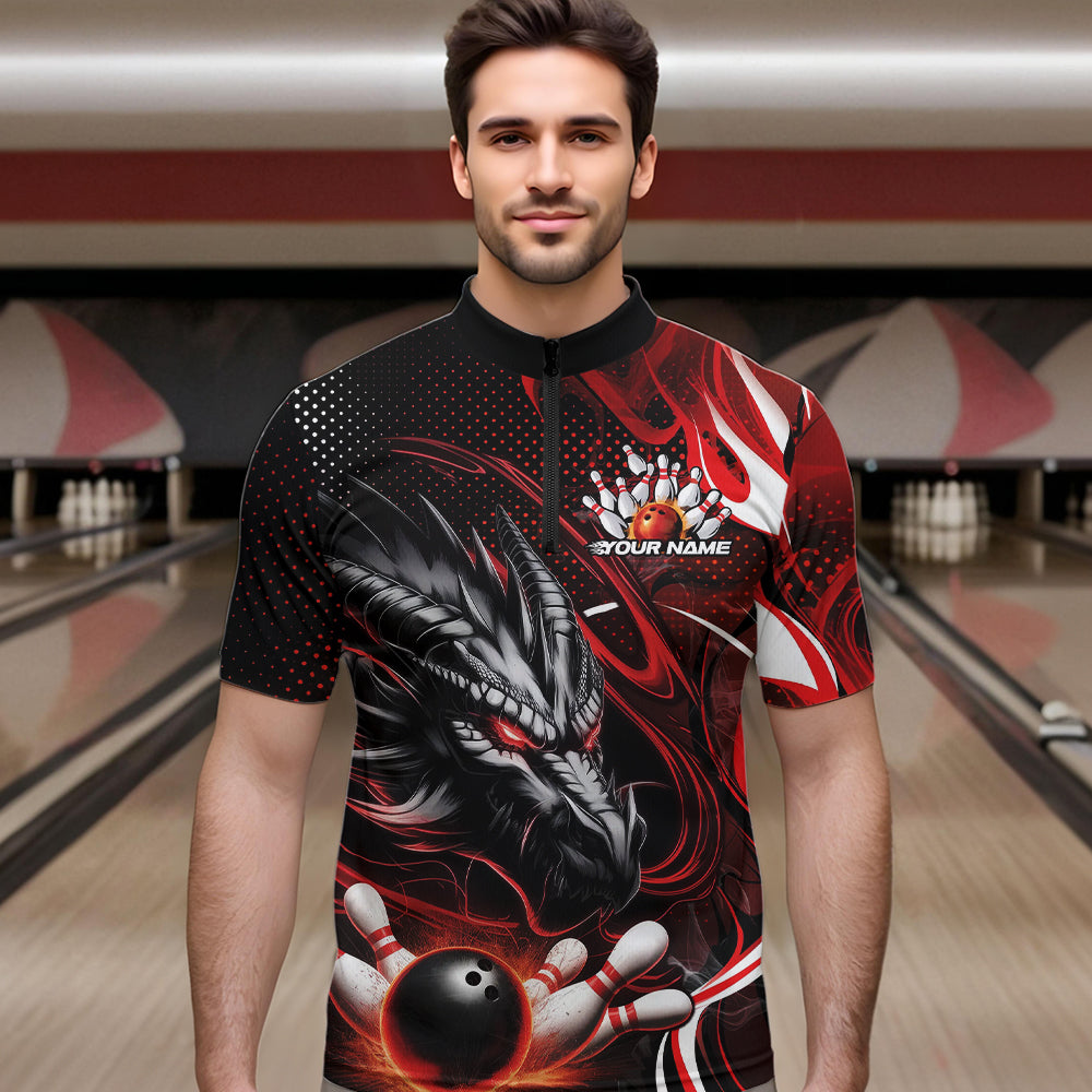 Custom Black And Red Flame Dragon Bowling Jerseys, Dragon Bowling Team Men Quarter-Zip Shirts IPHW8919