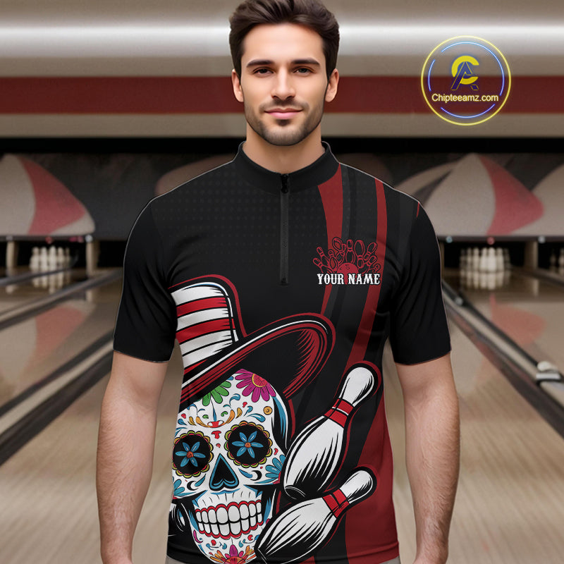 Custom Black And Red Sugar Skull Bowling Team Quarter-Zip Shirts For Men, Bowling League Shirt IPHW9256