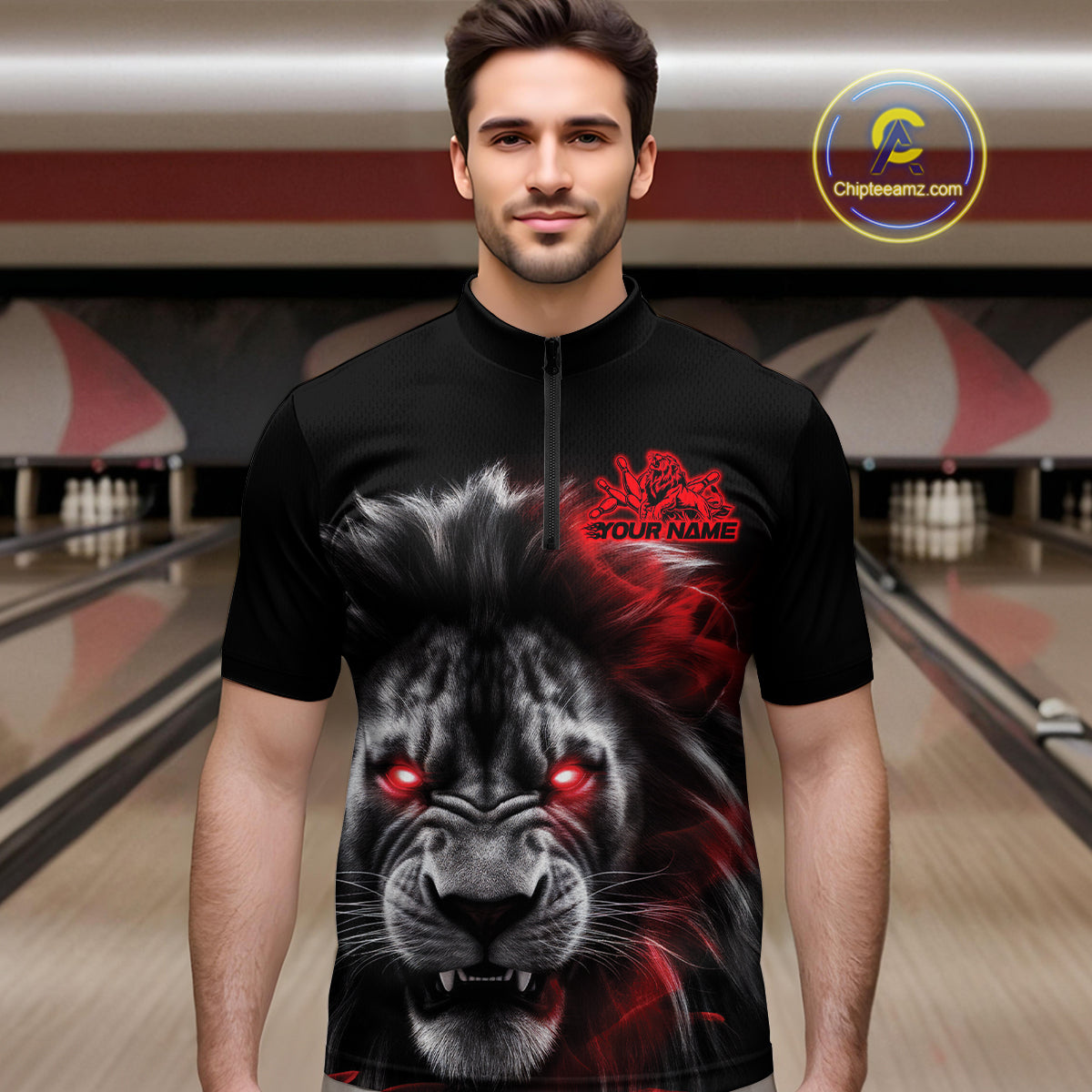 Custom Black And Red Lion Bowling Quarter-Zip Team Shirts For Men, Lion Bowling Jerseys IPHW9328