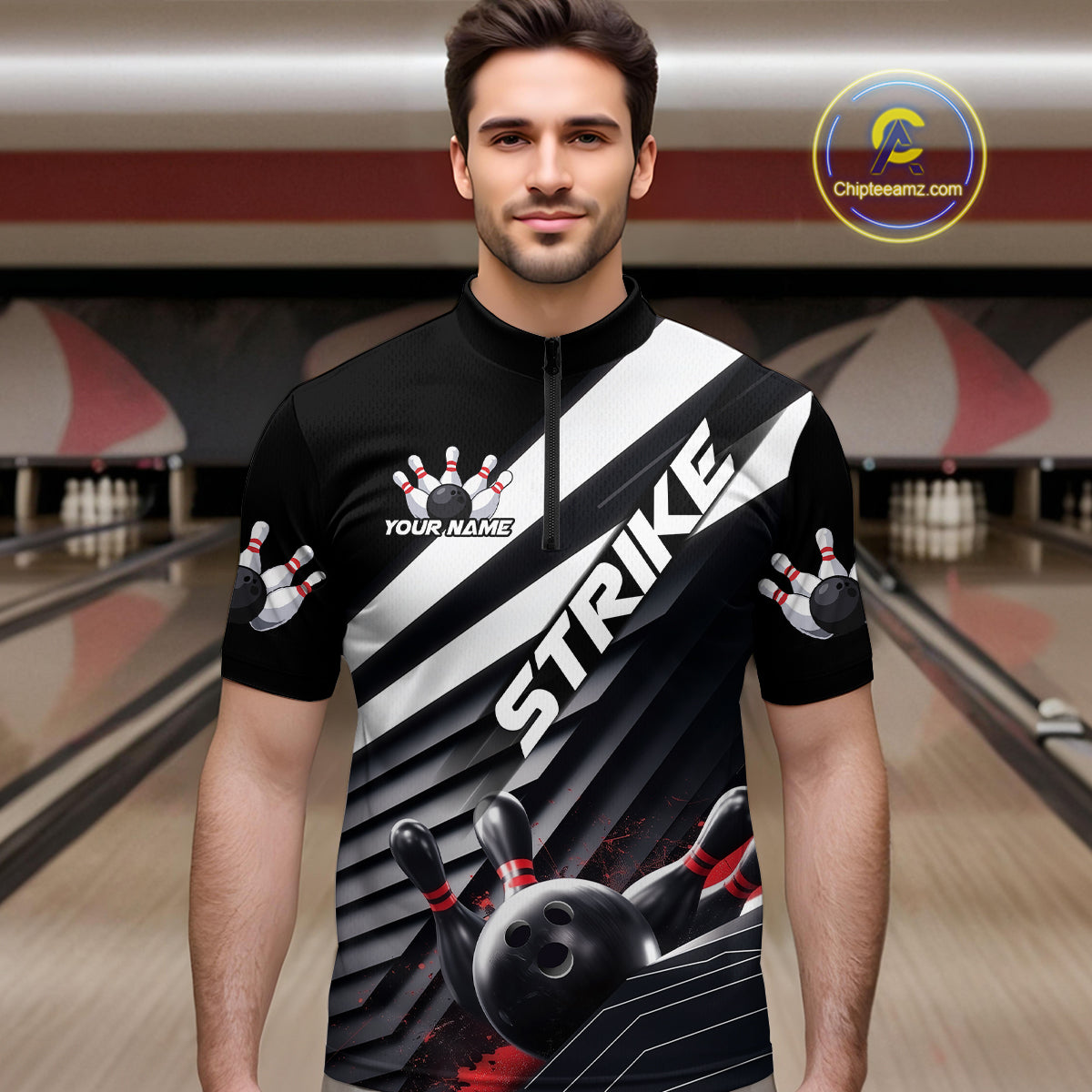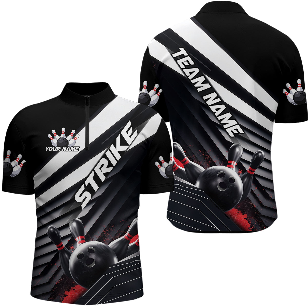 Custom Black And Red Strike Bowling Quarter-Zip Shirts For Men, Bowling Team Uniform IPHW9627