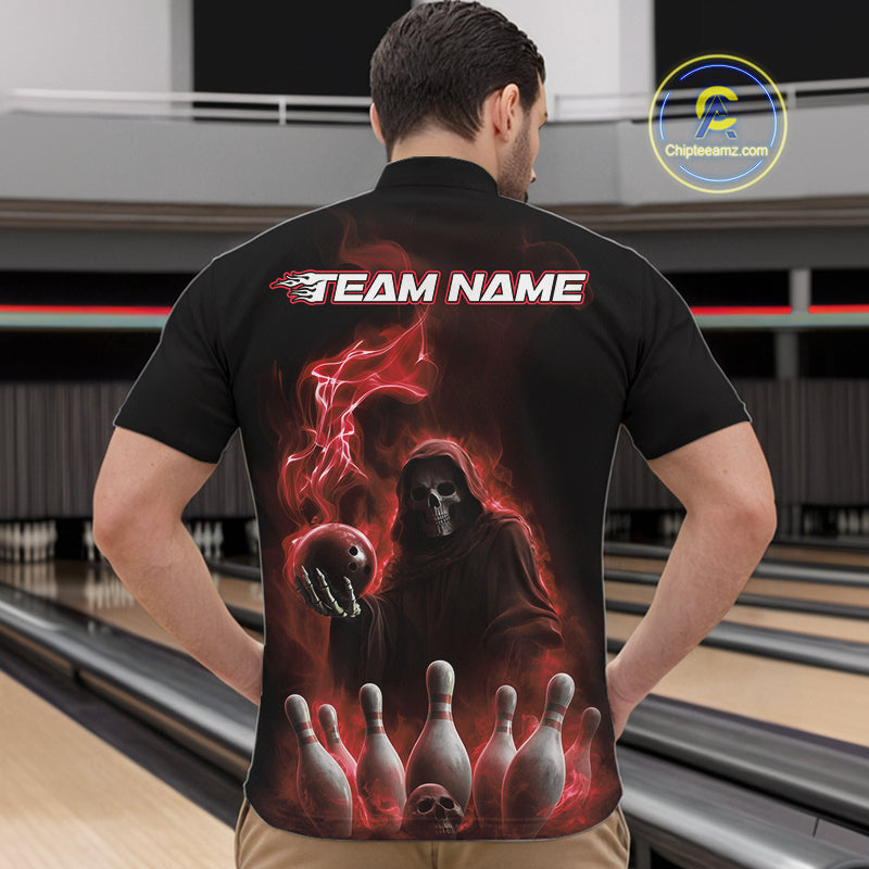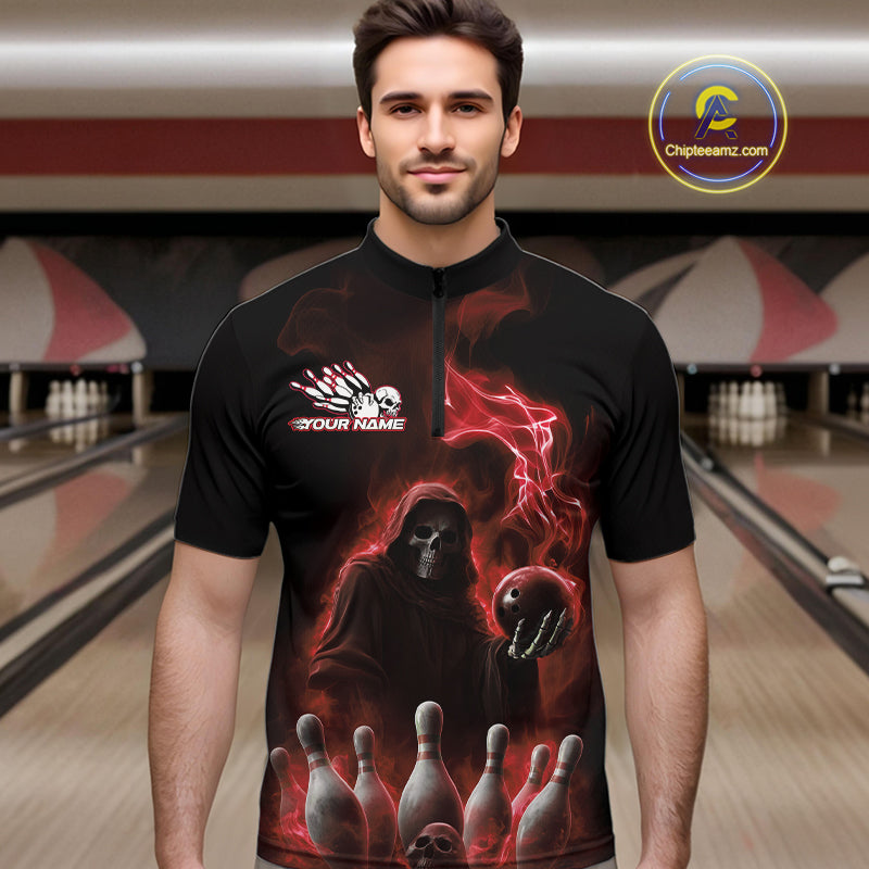 Custom Red Flame Grim Reaper Bowling Men Quarter-Zip Shirts, Skull Halloween Bowler Outfit IPHW9735