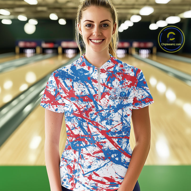 Custom Red, White And Blue Splatter Patriotic Bowling Quarter-Zip Team Shirts For Women IPHW9263