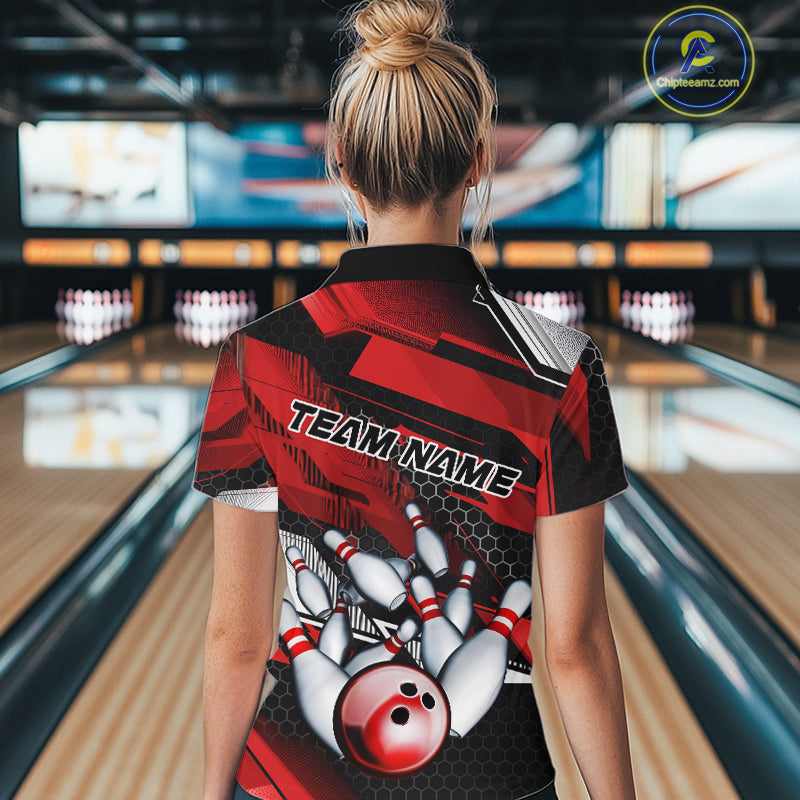 Custom Black And Red Hexagon Pattern Bowling Women Quarter-Zip Shirts, Team Uniform IPHW9420