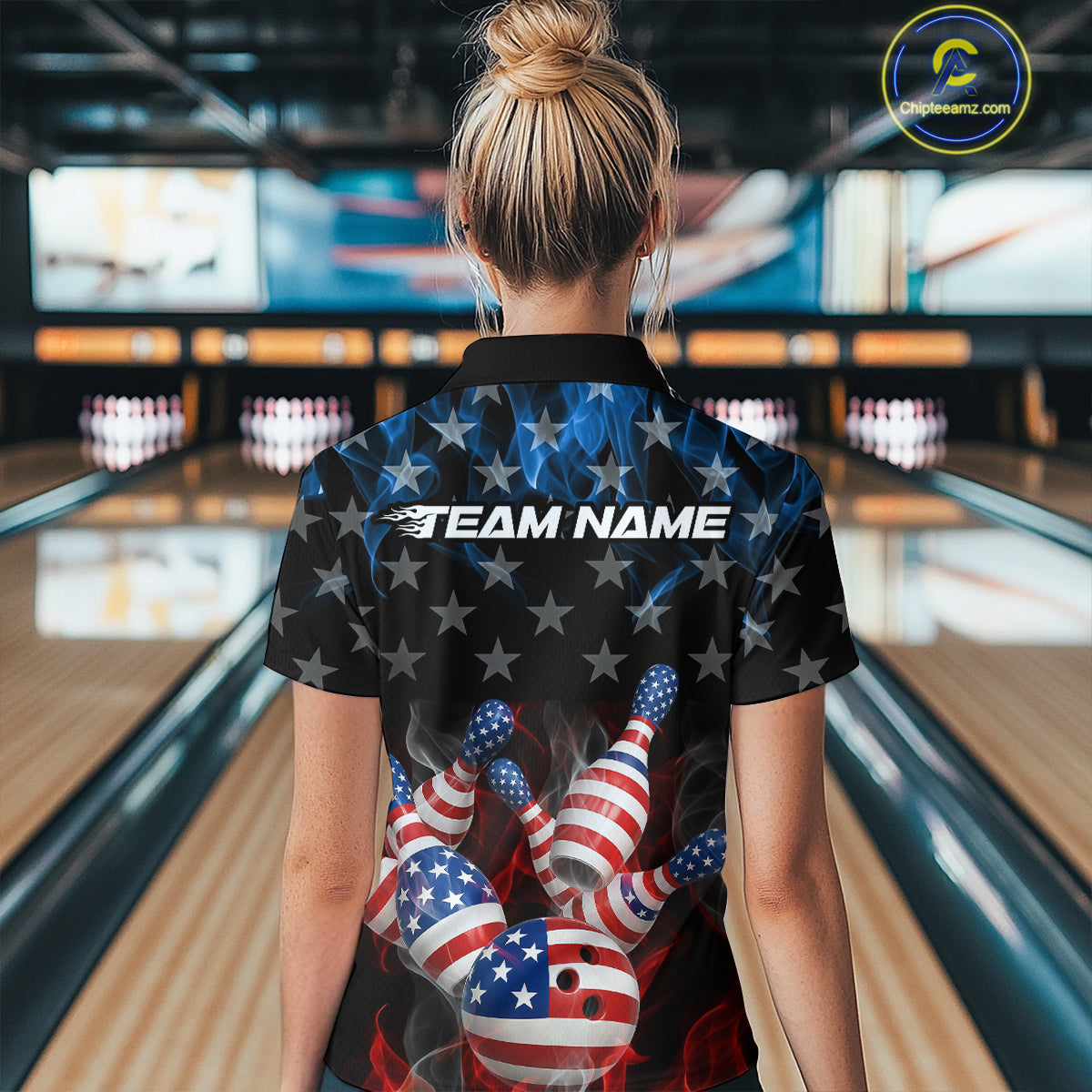 Custom Red And Blue Flame American Flag Patriotic Bowling Women Quarter-Zip Shirts IPHW9716