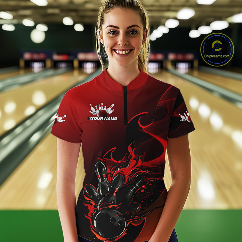 Custom Black And Red Flame Bowling Team Women Quarter-Zip Shirt, Bowling Tournament Shirt IPHW9868