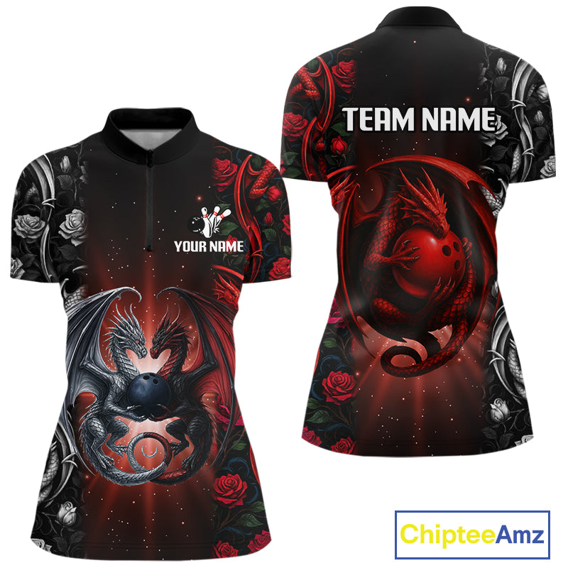 Red Dragon Roses Pattern Custom Bowling Polo, 1/4 Zip shirts For Women, Dragon Bowling League Shirt NQS10626