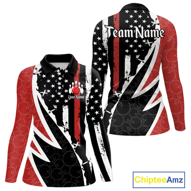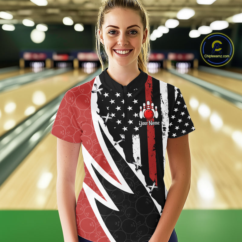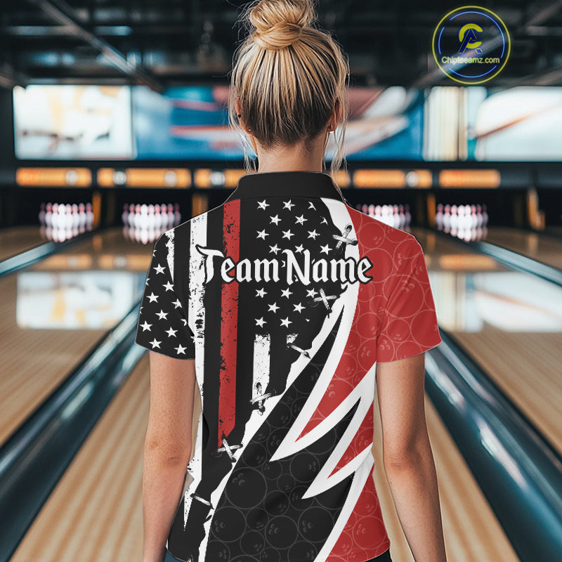 Red, White and Black American Flag Bowling Shirts for Women Custom Patriotic Team Bowling Jersey NQS10429