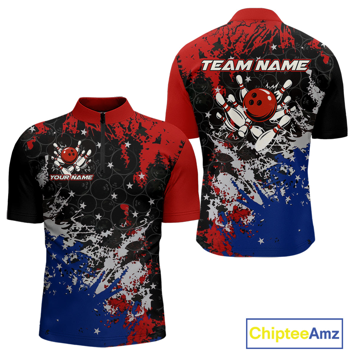 Red, White and Blue Camo Bowling Polo, Quarter Zip shirts for Men Custom Patriotic Gift For Bowlers NQS10589
