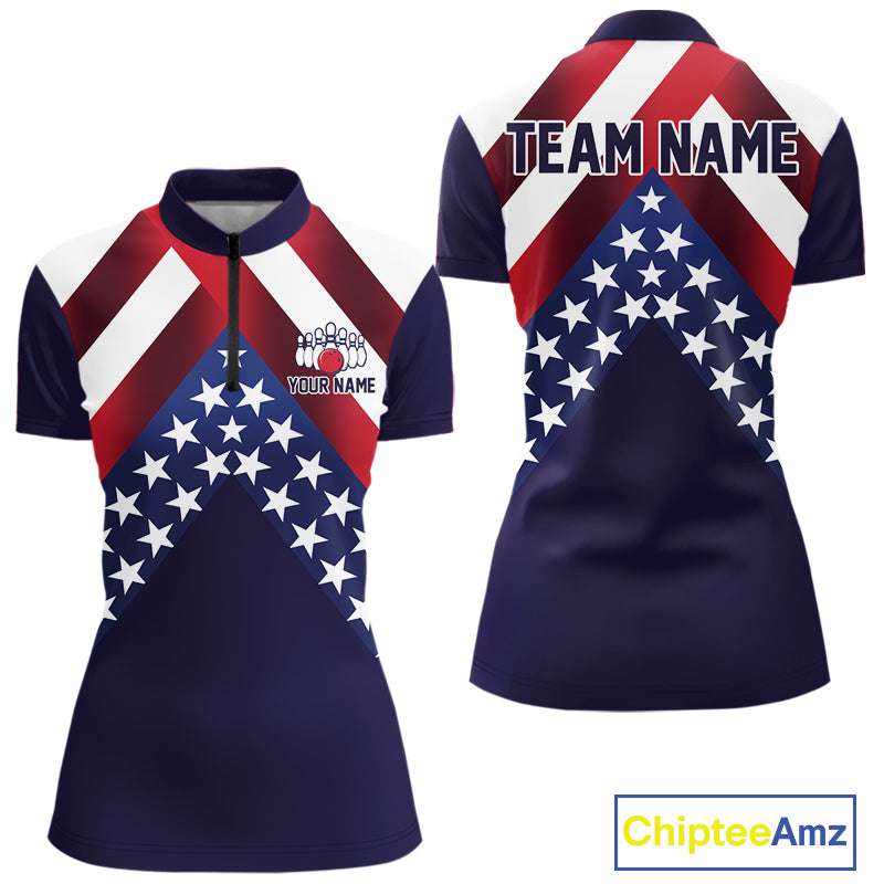 Red, White & Blue American Flag Women Bowling Shirts Custom Patriotic Team Bowling Jersey NQS10226