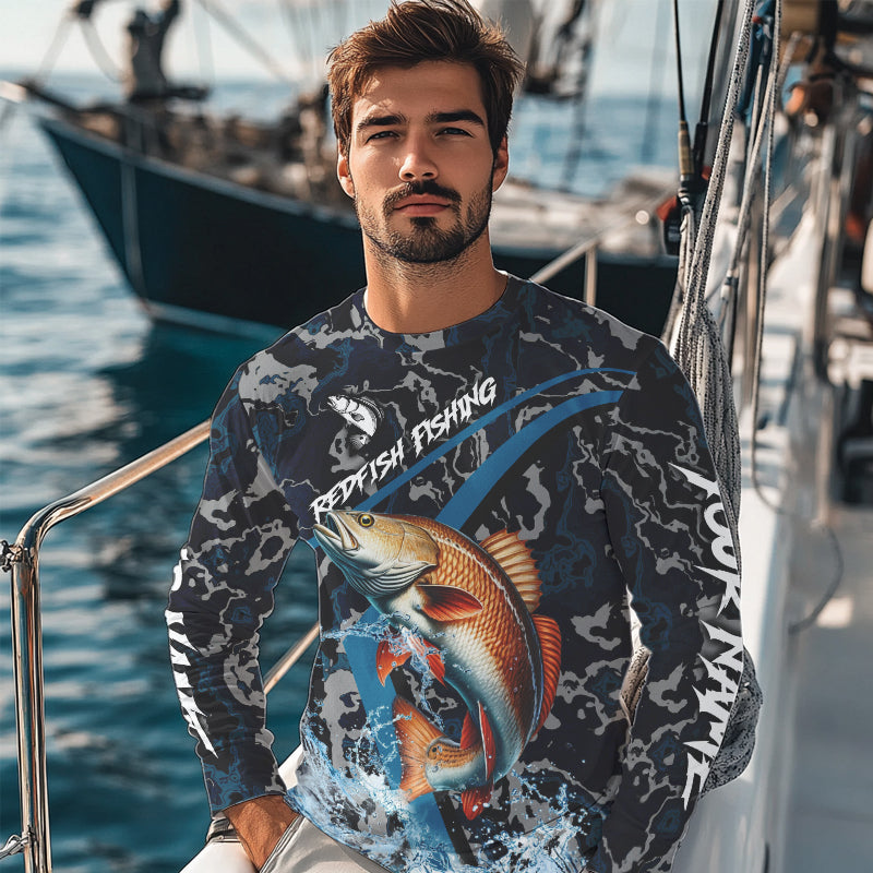 Custom Redfish Fishing Camo Long Sleeve Fishing Shirts, Personalized Red Drum Fishing Team Jerseys NQS9703