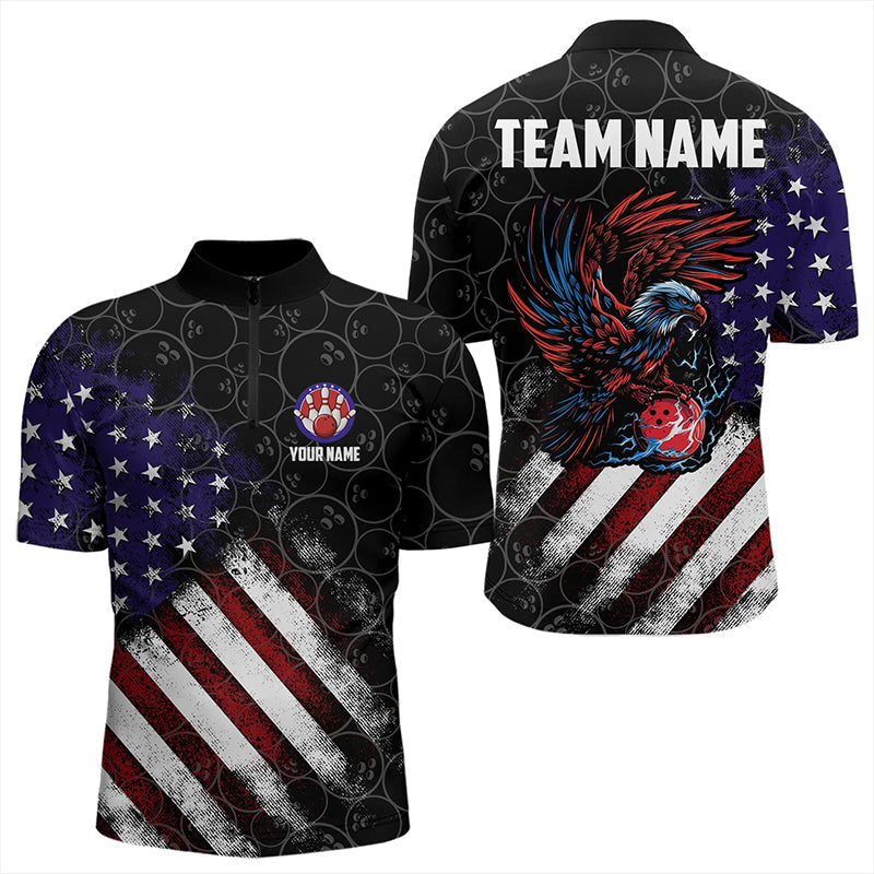 Retro American Flag Eagle Bowling Polo, Quarter Zip Shirt for Men Custom Patriotic Bowling Team Jersey NQS9162