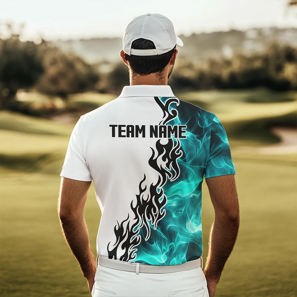 Blue Turquoise Flame pattern Black and White Mens golf polos shirts custom golf attire for men NQS9436