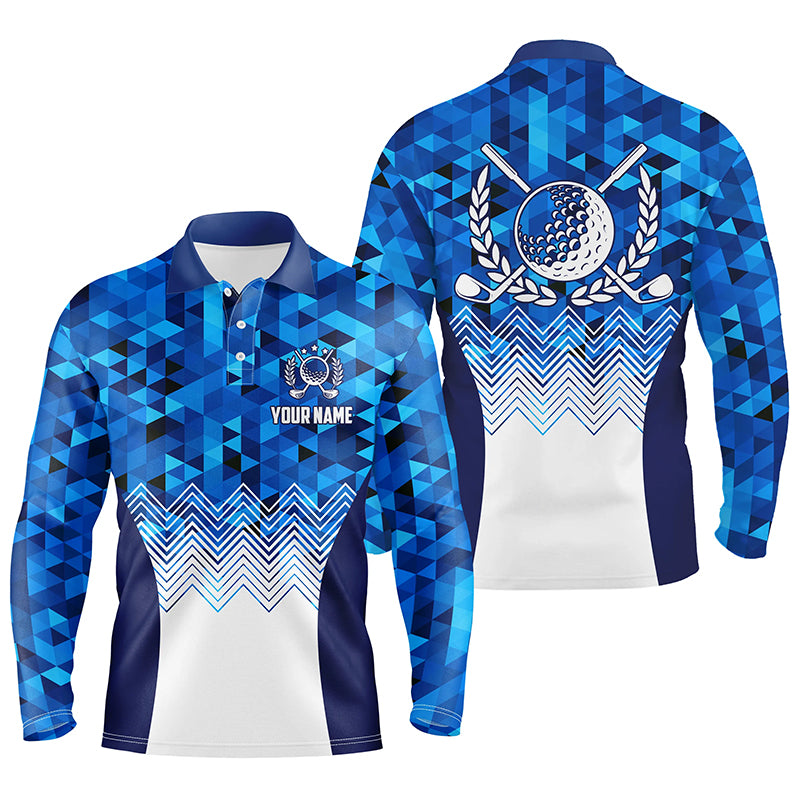 Mens Blue Geometric Golf Polo Shirts Custom Triangle Pattern Golf Shirts For Men, Cool Golf Gifts LDT0187