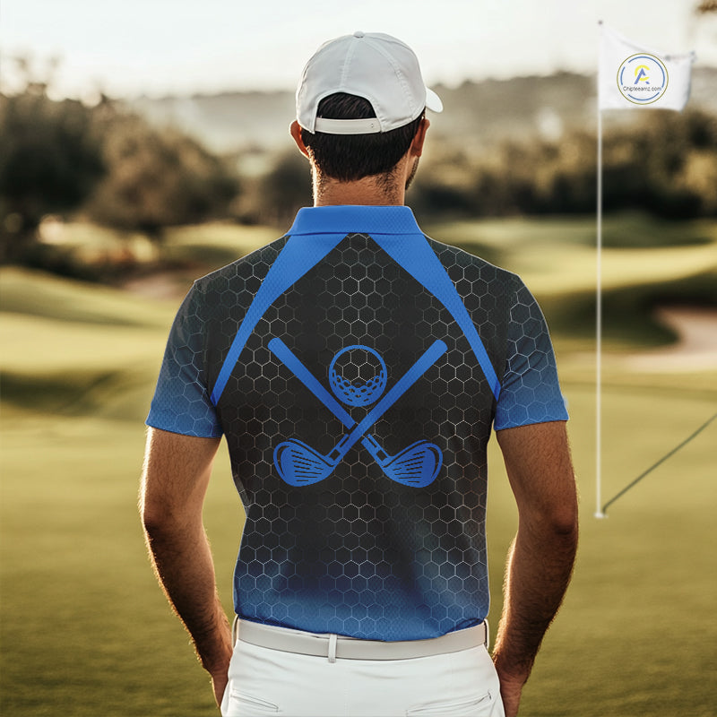 Mens golf polo shirts custom black and blue hexagon pattern golf outfits men, cool golf gifts NQS10317