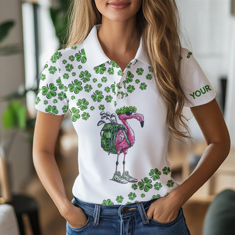 Funny Flamingo Green clover pattern White golf polo shirt for Women Custom St Patrick Day golf apparel NQS9399