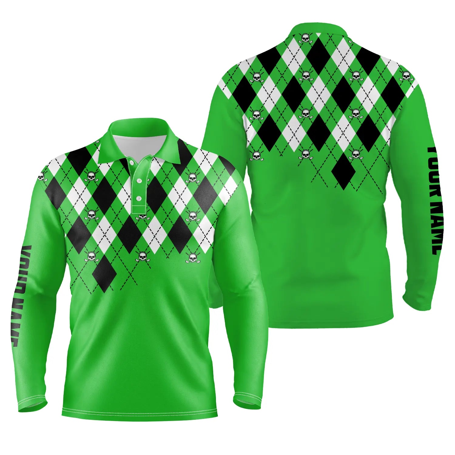 Mens golf polo shirt plus size green argyle plaid golf skull pattern custom name mens green golf tops NQS4966