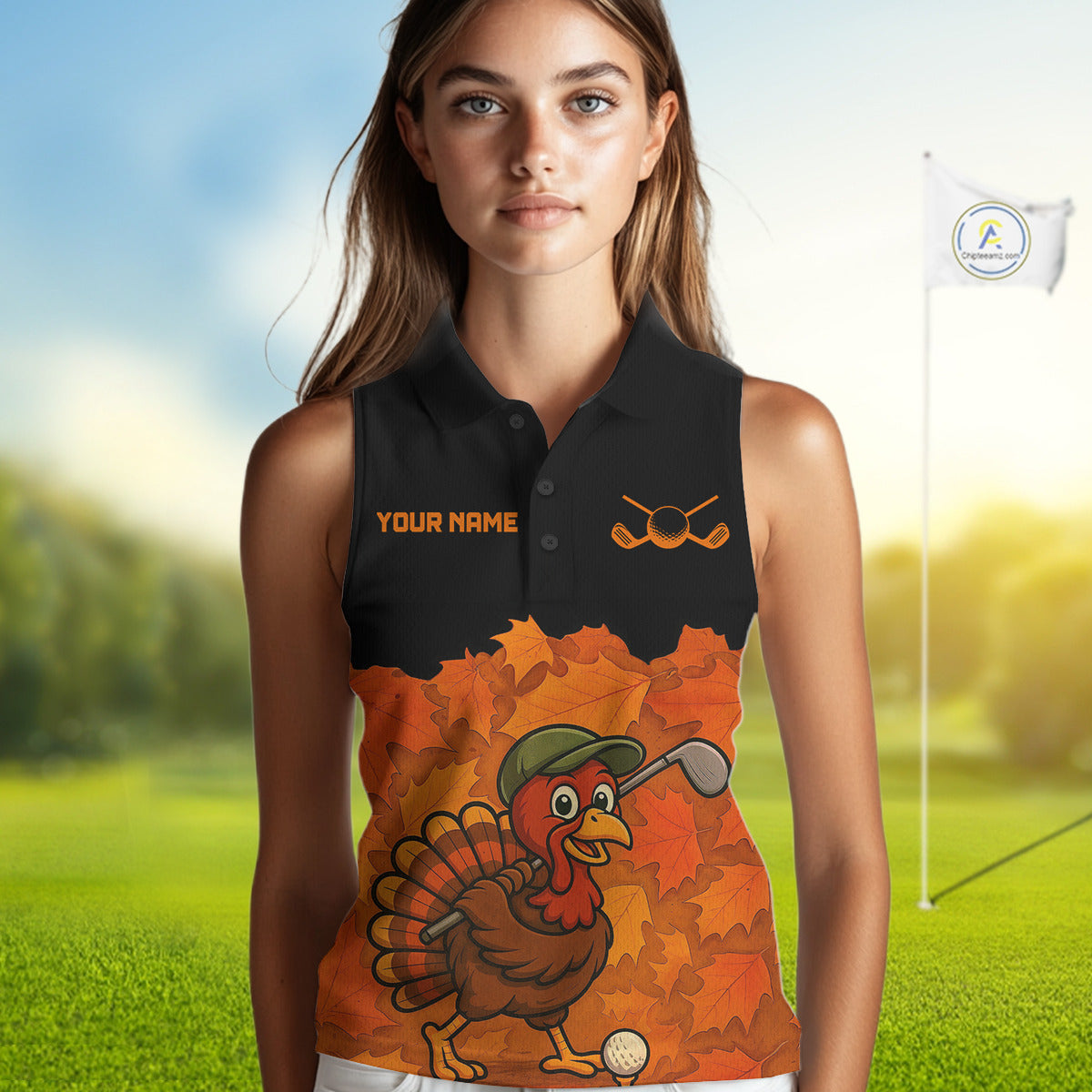 Black and Orange Autumn Leaf Custom Turkey Women Sleeveless Golf Polo Shirt, Thanksgiving Golf Attire NQS10700