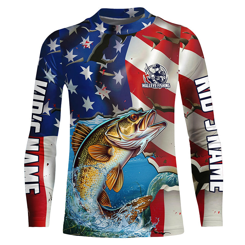 Personalized American Flag Walleye Long Sleeve Fishing Shirts, Patriotic Walleye Fisherman Jerseys IPHW6100