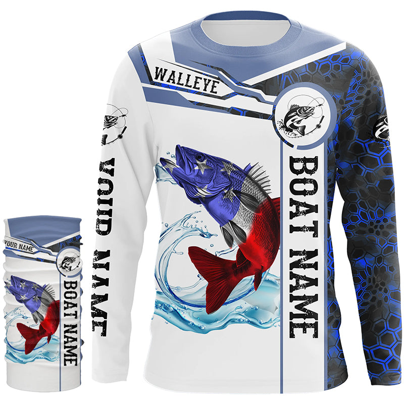 Walleye Fishing blue camo American Flag Custom name & boat name performance Long Sleeve Fishing Shirts NQS3457