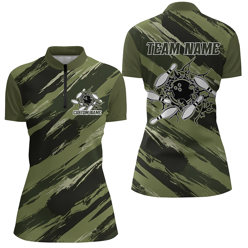 Custom Navy Green Camo Bowling Shirts For Women, Bowling Strike Team Shirts IPHW6449