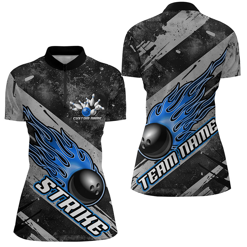 Black And Blue Flame Bowling Ball Custom Team Shirts For Women, Tournament Team Jerseys IPHW6479