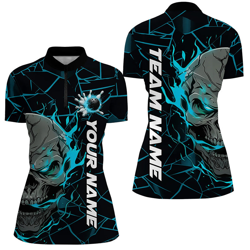 Custom Blue Flame Skull Bowling Shirts For Women, Halloween Bowling Team Outfits IPHW7098