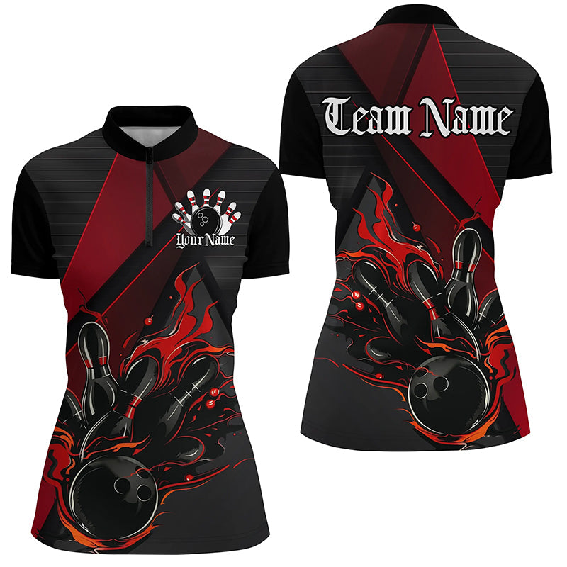 Custom Black And Red Flame Bowling Shirts For Women, Bowling Team Jerseys For Bowlers IPHW7203