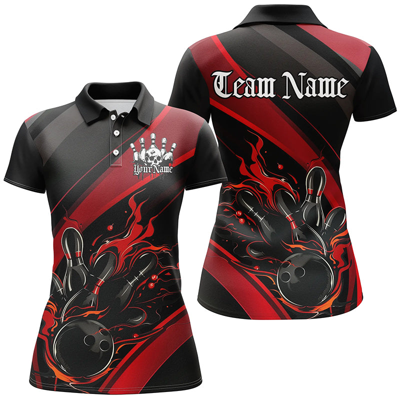 Custom Black And Red Flame Bowling Shirts For Women, Skull Halloween Bowling Team Outfits IPHW7205