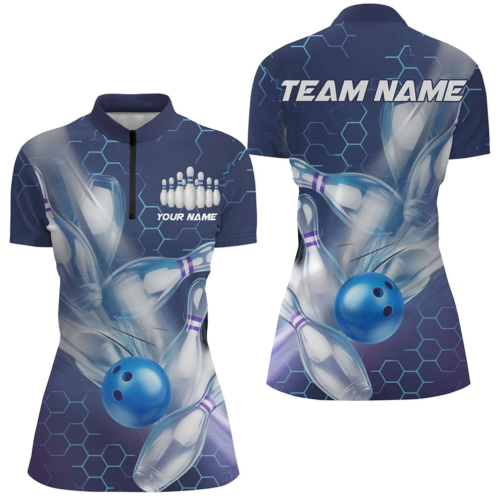 Custom Blue Striking Bowling Shirts For Women, Bowling League Shirts Bowling Team Jerseys IPHW7665