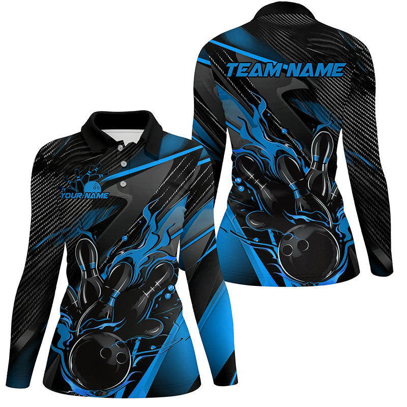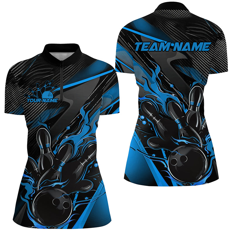 Black And Blue Custom Flame Bowling Shirts For Women, Fire Bowling Team Shirt Bowler Jersey IPHW7932