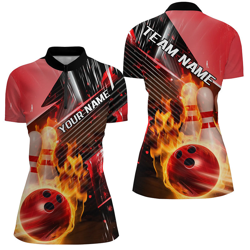 Black And Red Custom Flame Bowling Shirts For Women, Fire Bowling Team Shirt Bowler Outfit IPHW7938