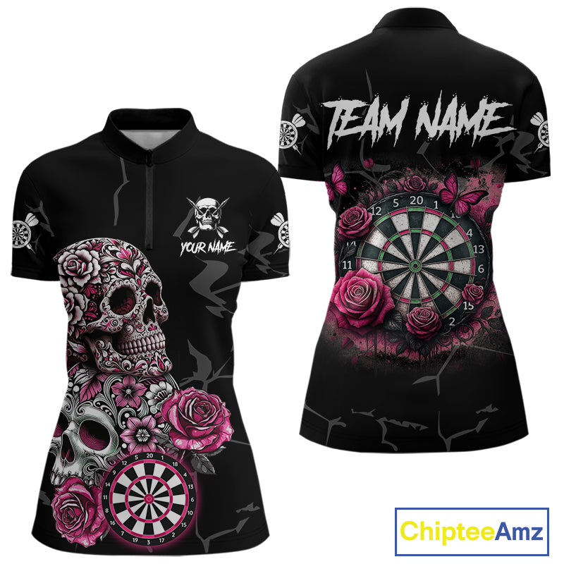 Personalized Pink Funny Skull Roses Darts Shirt For Women Custom Darts Team Jersey, Darts Outfit TDM4354