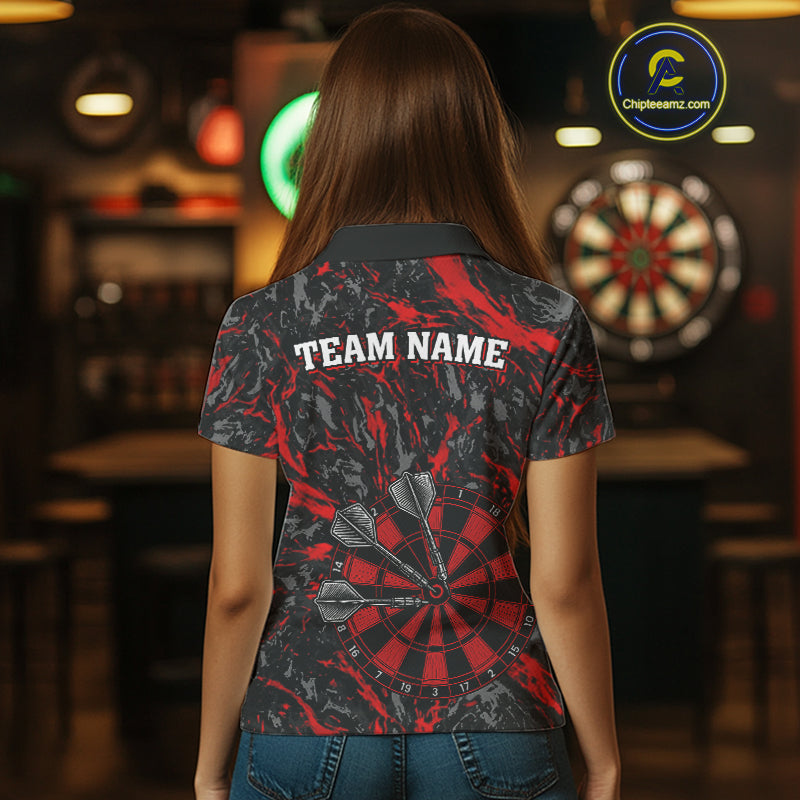 Custom Black And Red Grunge Camo Dart Shirts For Women, Camouflage Dart Team Jersey Polo & 1/4 Zip TDM3959
