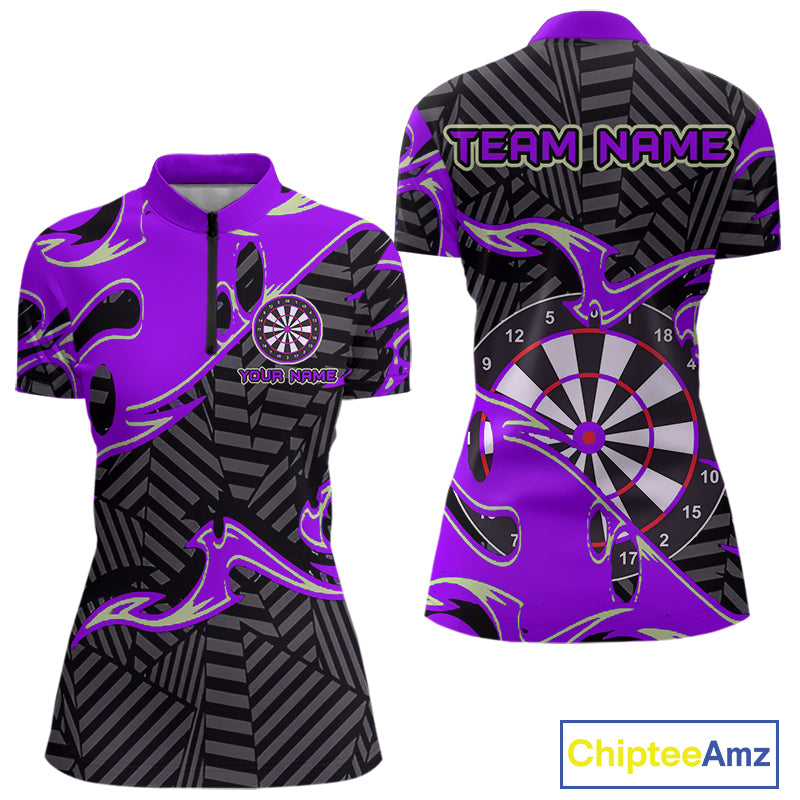 Custom Black And Purple Tribal Flame Dart Shirts For Women, Darts Team Jerseys Polo & Quarter Zip TDM3971