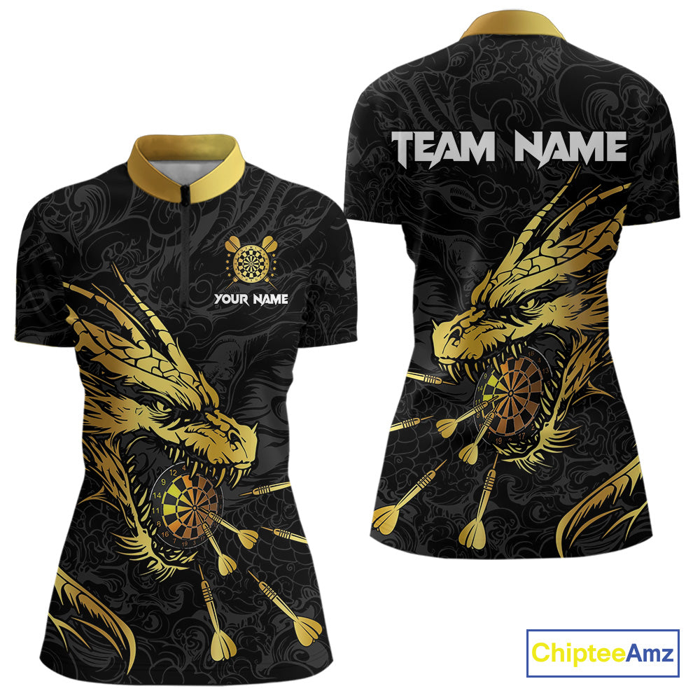 Personalized Black Gold Dragon Dart Shirts For Women Custom Darts League Team Jersey Polo & 1/4 Zip TDM4142