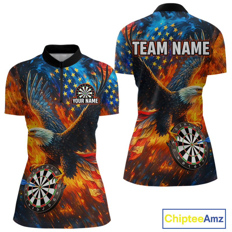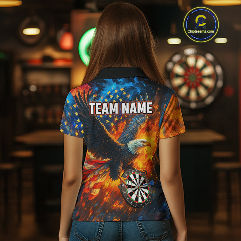 Personalized Orange Flaming US Flag Eagle Darts Shirt For Women, Patriotic Darts Team Jerseys TDM4438