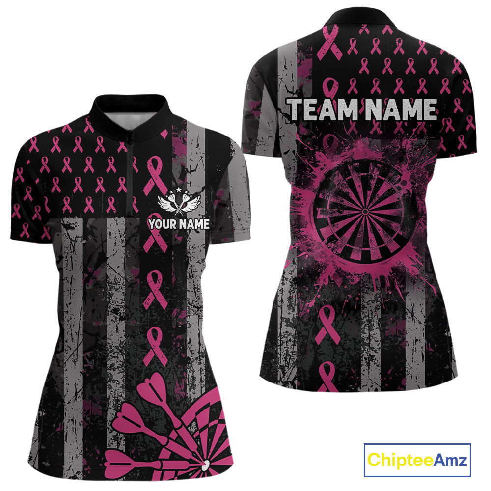Personalized Grunge US Flag Pink Ribbon Patriotic Darts Shirt For Women, Breast Cancer Darts Jersey TDM4501